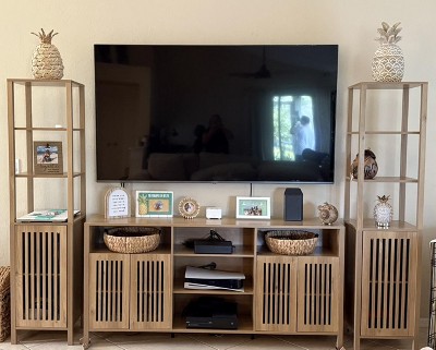 Versatile Storage: Features multiple shelves and storage compartments, perfect for organizing books, decor, and media accessories, combining functionality with style.