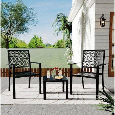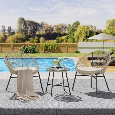 Patio Bistro Set: Includes 2 high back rattan armchairs, 2 soft seat cushions, 2 plush back cushions, and 1 cocktail table with tempered glass top, perfect for patios, porches, balconies, decks, and poolsides.