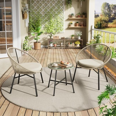 • Patio Bistro Set: Includes 2 high back rattan armchairs, 2 soft seat cushions, 2 plush back cushions, and 1 cocktail table with tempered glass top, perfect for patios, porches, balconies, decks, and poolsides.