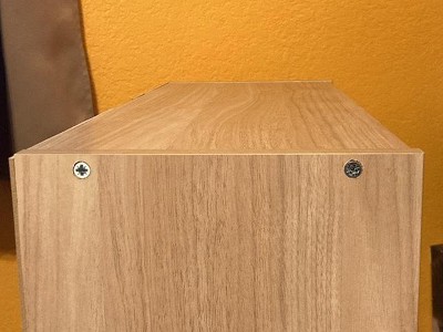 Not what I expected, especially from Target. Large & shiny construction screws that look ridiculous. The paneling in the back is constructed with 2 duct tape like strips. Lastly, a half moon shaped hole at the top which will allow dust in and on my books. Apparently it is a handle of some sort which is absurd.