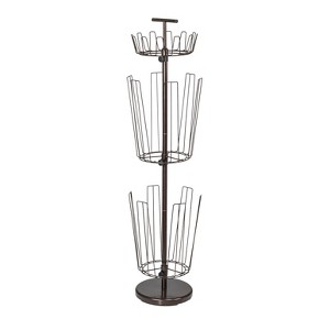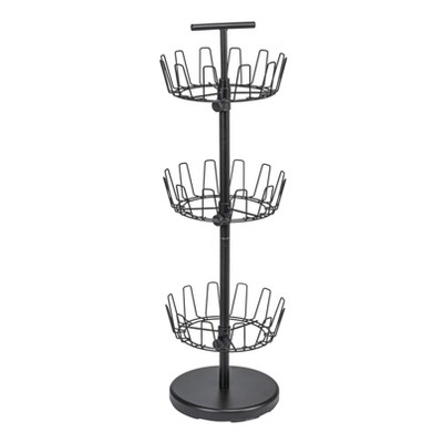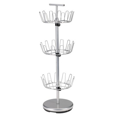 This boot-tree style shoe rack holds up 18-pairs of shoes on 3-spinning tiers. Its weighted 12 in. diameter base lets shoes store vertically saving space in the closet. Perfect for most boots. Sturdy, stable and easy to assemble. Screw together steel center pole and adjustable tiers. Also, great storage for accessories.