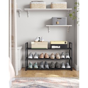This sturdy 3-tier metal shoe rack provides efficient storage for 12-15 pairs of shoes while maintaining a sleek, space-saving profile. The durable powder-coated steel construction offers long-lasting stability, and the stackable design allows for vertical expansion when needed. Its open-air concept keeps footwear organized and easily accessible while promoting proper ventilation. The minimalist black frame blends discreetly with any decor, making it perfect for keeping entryways, closets or living areas clutter-free. Each tier features a slight upward curve to prevent shoes from sliding off while accommodating various styles from sneakers to boots. Material: Metal Tube, Plastic Connector Product Size: 11.8"D x 36.2"W x 21.3"H (30 x 92 x 54 cm) Product Weight: 2.2 lb (1 kg) Max. Static Load Capacity per Tier: 11 lb (5 kg) Overall Max. Static Load Capacity: 33 lb (15 kg)