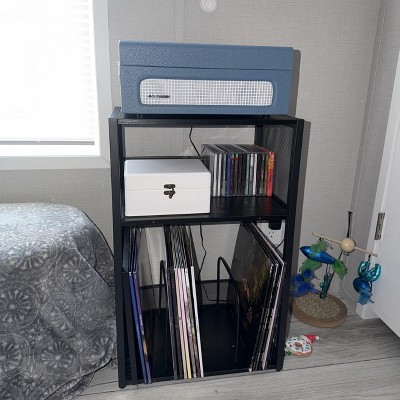 This 3 - tier record player stand doubles as a stylish side table, making it a versatile addition to your living room or bedroom. The top tier is perfectly sized to hold a record player, providing a stable surface for your music - playing needs. The middle and bottom tiers offer ample space for vinyl record storage, with the capacity to hold up to 100 albums. Its design is not only functional but also aesthetically pleasing, complementing various interior decors. Crafted from quality materials, it ensures durability and sturdiness while serving as a practical piece of furniture for music enthusiasts. Material: Particleboard, Steel Product Weight: 13.4 lb (6.1 kg) Max. Static Load Capacity of the Top: 44 lb (20 kg) Max. Static Load Capacity of the Middle Shelf: 22 lb (10 kg) Max. Static Load Capacity of the Bottom Shelf: 44 lb (20 kg)