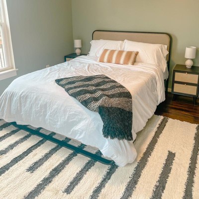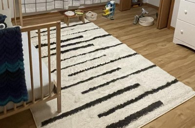Inspired by vintage Moroccan rugs, our modern striped rug has a soft, low shag pile. The central stripe pattern is woven in black on an ivory background; our inspired design recalls traditional handwoven rugs. Add some Bohemian style to your living room, bedroom, or reading nook with this easy-care rug.