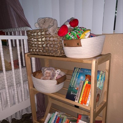 I have used this book shelf in a mostly decorative way, with plants on top and pictures on the shelves. It is lovely and light and I enjoy the style. When I needed a book shelf for my little granddaughters, who are 3 and 1, it was a perfect choice. I place the books face out, so they can see what they want. And the book case is small enough so that it fits in a small corner, and low enough so that