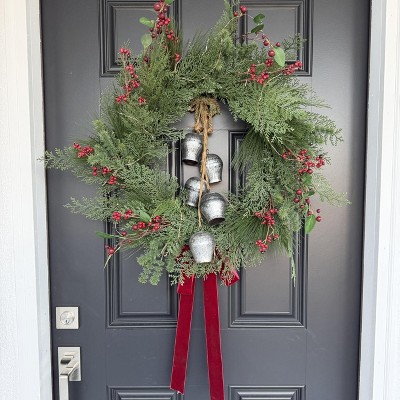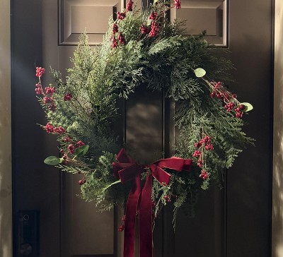 [This review was collected as part of a promotion.] This is a very beautiful Christmas wreath for the holiday season. I absolutely loved the greenery with the red cranberry accents inside the wreath. The bright red bow really looks beautiful against the wreath. I hung this on my porch and got so many compliments. The greenery looks quite real, even though it is fake. This is a large wreath so if you have a big door this would be the perfect wreath for you