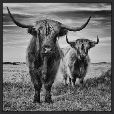 ART DESCRIPTION: Living in the wilds as they do, these two longhorn cows have developed shaggy fringes that match well with the swishing grass and streaming clouds in this black and white photograph. This Amanti Art canvas art print was created by Stephane Pecqueux and printed by Amanti Art in Madison WI. The canvas is stretched by hand and finished with a float frame. Individually made using traditional custom framing techniques, it has the quality you would expect from your local frame shop. Because of our attention to detail and focus on artistry, architects, interior designers, and homeowners alike choose this framed canvas artwork to create beautiful living spaces.