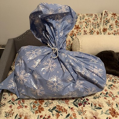 This is essentially and cute, festive, and expensive trash bag. I was not impressed for the price. I like the idea but would have hoped for something a bit bigger quality for what you pay for it. Not worth it in my opinion, I’ll just get crafty with wrapping paper. I also don’t love that because it’s plastic, it’s not recyclable like most wrapping supplies.