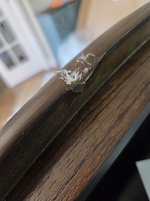 This table and 4 chairs fit perfectly in our office. This will give us a little area to sit down with our clients and go over paperwork. It is professional looking and much less "stuffy" than a traditional conference table. The only downside was that we received it with a scratch on the rim of the table as if it had been dragged on the floor so part of the finish was scraped off. But beside the 5 inch scratch area on the rim, this table and chair set works perfectly for us.