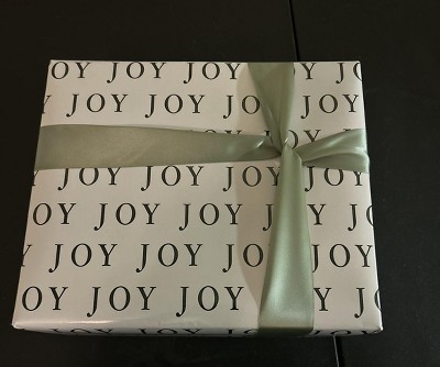 A: The wrapping paper features an allover JOY text print in green on a cream background.