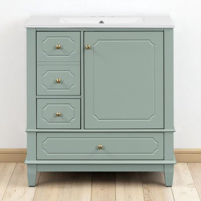 Upgrade your bathroom with this 30-inch freestanding vanity that seamlessly blends functionality and elegant design. Crafted with a solid rubberwood frame and high-quality MDF panels, this vanity features a smooth painted finish, a durable ceramic sink, and smart storage solutions that make organizing your bathroom essentials effortless. Its compact footprint and thoughtful layout are ideal for maximizing space in small to medium-sized bathrooms without compromising on style or storage.