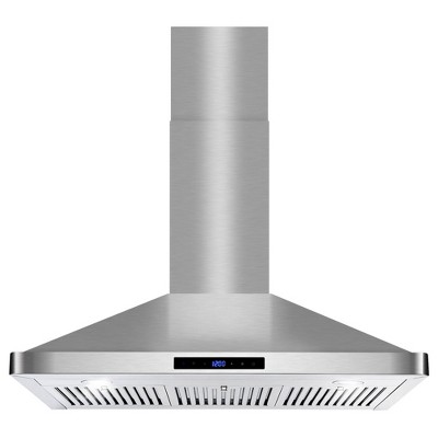 Efficiently clears smoke, grease, and cooking odors with three adjustable speeds (Low/Medium/High). The convertible duct system adapts to ducted (6" round vent) or ductless setups, ensuring powerful airflow for stovetops up to 30 inches. High-grade stainless steel with brushed finish resists smudges and stains. Pyramidal design adds modern style while enabling effortless cleaning—just wipe with soapy water, no harsh chemicals needed. Operate via touch panel, gesture sensing, or included remote. Adjust fan speeds, activate bright 3W LED lights, or set 15-minute auto-shutoff. LCD display ensures clear settings visibility. Two reusable aluminum baffle filters trap grease without clogging. Safely clean in dishwasher’s top rack for optimal airflow and enhanced kitchen fire safety. Operates below 55 dB on high speed with 230W motor. ETL-certified, meeting NFPA/ASHRAE standards for energy-efficient, peaceful cooking. Includes adjustable chimney extensions (22–37 inches) for flexible mounting. Compatible with standard 120V outlets. Detailed instructions provided (hardware not included).
