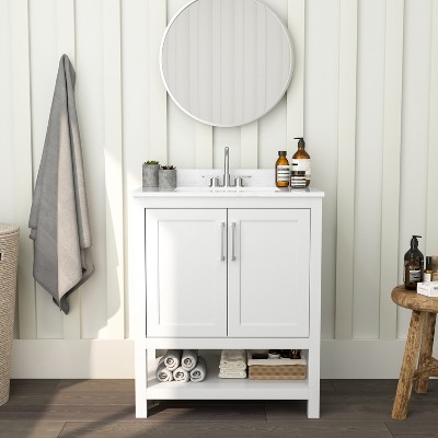Elevate your bathroom with this charming 30" Retro Bathroom Vanity Set, combining vintage-inspired design with modern functionality. This complete vanity solution features a glossy ceramic sink paired with a spacious storage cabinet offering 3 smooth-gliding drawers and soft-closing doors. Crafted from premium solid wood frame and high-quality MDF boards, this vanity boasts exceptional durability with a 300lb overall weight capacity (50lb per panel/drawer). The unique groove pattern and exquisite metal handles add distinctive retro charm, while the neutral finish complements various decor styles. Perfect for powder rooms or main bathrooms, this freestanding vanity provides ample storage space for toiletries and towels, all while delivering quiet, smooth operation thanks to its soft-close hinges and premium drawer slides.
