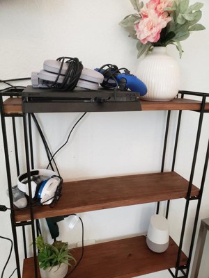 - Decorative floating wall shelves with black metal frame and 3 caramel wood shelves