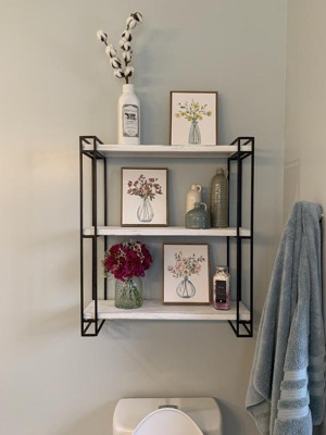 Rustic farmhouse design meets functionality with this floating wall shelving. Constructed of black metal frame with three solid wood shelves, this floating shelving can be used to display your books, photo frames, or knickknacks in your living room or home office. Each shelf measures 26 inches wide by 7 inches deep and there is 12 inches of vertical space between each shelf. The display dimensions of the floating shelves are 26 inches wide by 7.25 inches deep by 30.5 inches high. This decorative wall shelving is versatile, functional, and will be a beautiful accent in any room of the home.