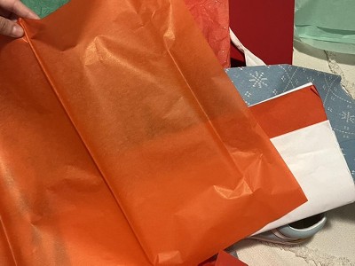 See pic. I opted for wrinkled red paper from last year over this. It's too orange.