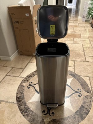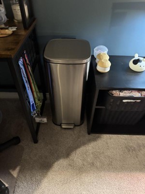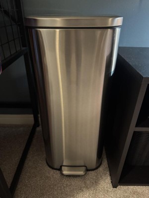 Decent sized trash can that fits in small spaces The pedal to open the lid works great and the lid closes slowly so you don't accidentally slam it on your fingers when closing. The stainless steel has been fairly easy to clean, but you definitely notice when it's dirty. Overall not bad for the price point