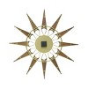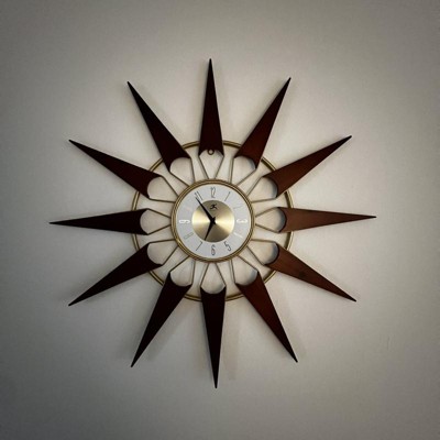 Calling all history buffs and romantics! The Nova wall clock gets its inspiration from the clean, natural wood tones and gold metallic from the turn of the century. Oversized at almost 31 inches in diameter, this is a great pick for hanging in your den, living room, or bedroom. At the center of the sunburst, there is a circular metallic gold frame displaying numbers against a silver face. The clock face is majestically surrounded by aged solid wooden rays. Pair it with geometric accent pieces and you will have a space that gives the impression of being created by a professional interior designer! The time is notified by sleek black metal hands, a perfect touch of contrast. This wall clock has an open face and no lens concept, thus retaining its midcentury modern theme in the true spirit.