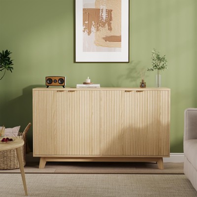 Elevate your space with this 31.5" Fluted Sideboard Buffet Cabinet, where style meets smart storage. Featuring 2 doors and an adjustable shelf, its 15.7" deep compartments easily house large dishes, appliances, or board games. The fluted door design with gold-tone handles adds modern elegance, while sturdy wood legs ensure durability. Perfect as a buffet, TV console, entryway organizer, or office coffee bar, this versatile credenza blends seamlessly into any décor. Quick 30-minute assembly included.
