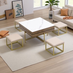 - Modern Square Lift-Top Coffee Table Set with Storage & 4 Ottomans White & Walnut: A multifunctional, space-saving centerpiece for any home. Features lift-top functionality, hidden storage, included ottomans, and a sleek white & walnut finish, ideal for everyday use and entertaining guests.