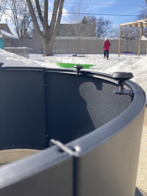 A: The fireplace has a round shape with a baked-on black paint finish.