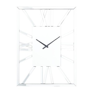 Like a functional art piece for your wall, this rectangular wall clock will become a focal point or finishing touch for any room in your glam-themed home with its elegant glass frame. Requires 1 AA battery, not included. This item ships in 1 carton. The clock features a silver rectangular clock face with Roman numerals and simple clock hands. The clock mechanism runs silent. Can be hung vertically using the D-rings on the back; nails and screws not included. Suitable for indoor use only. This item ships fully assembled in one piece. This is a single silver colored oversized wall clock. Glam style.