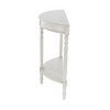 - •Gray wood side table features pillar style posts with solid bottom shelf in a half-round shape structure that offers seamless adjacent wall installation