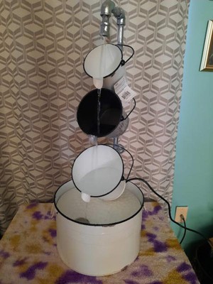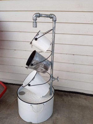 [This review was collected as part of a promotion.] I got the Alpine Corporation 33" Tall Rustic Metal Pails Fountain Yard Decoration. The cascading fountain is made of metal. A pump hidden in the lower washtub sends the water up the pipe and out the spout to the buckets where it flows down into the washtub again. The bottom wash tub has a cover to keep leaves from collecting in the tub. This is a beautiful fountain and can be used indoors or outdoors.