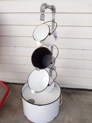 [This review was collected as part of a promotion.] This fountain is absolutely beautiful and even better than I imagined! The rustic look matches the rest of my yard decorations perfectly and is exactly what I needed. I was surprised that this doesn't really collect a bunch of dirt in the buckets either. It is made sturdy and very durable metal. I can sit on my patio and watch it all day long. Lastly, the sounds of the water trickling down from the buckets is so serene, it puts you in another world of peace.