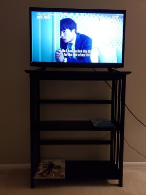 I bought this to use as a tv stand at the end of my bed since my bed is pretty high and it worked perfectly. I assembled it in 20mins all by myself and it hasn’t collapsed on my yet so yay me!