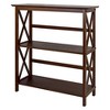 Storage with ease, this Montego X-Design Style Bookcase is constructed with solid wood for lasting use. 3 shelves provide ample storage space. A thorough finish gives this bookcase a strong, contemporary appearance. Perfect for home storage and decor. Light and easy assembly. Wall mount hardware provided. Product dim: 29.5"W x 11.75"D x 34"H. Weight capacity: 25lbs per shelf.