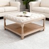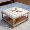 33" Large Square Ottoman Coffee Table, Tufted Linen Upholstered, Storage Shelf, Solid Legs, Beige
