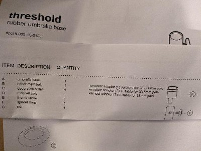 The product description online states this base accommodates a 2.28 or 2.29 inch umbrella pole in the highlights and specifications sections. The receiver pole is only 1.75" in diameter, absolutely cannot accommodate a pole larger than that. Even the largest adapter is suitable for a 38mm pole, which is about 1.5", according to the instructions. I have a 2" pole, which is really just bigger than 1.75" in diameter so this product is useless. I bought it solely based on the description which would have been perfect for my umbrella. The product itself smells like recycled rubber and has a good weight to it, so that matches the description and it seems like it would be suitable for a large umbrella - but only if it has a standard size or smaller pole!