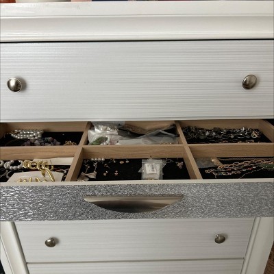 The Naima chest is in White Finish. With 6 spacious drawers is sure to provide style and functionality for any bedroom needs. The best part of the elegant piece is the glitter drawer-front jewelry compartment with felt lined. Every bedroom can use a touch of extra storage, and that applies to your little one's bedroom as well! Perfect for tucking away t-shirts and pants, adding a dresser like this is a great option for adding organization while also helping your child learn the importance of cleaning up.
