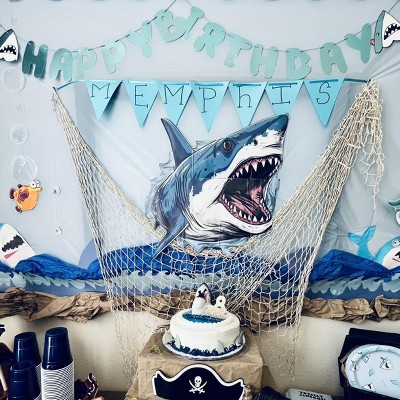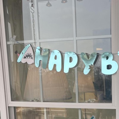 Bring some ferociously fun decoration to your kiddo's birthday party when you decorate with the Happy Birthday Shark Banner from Spritz™. This birthday decoration reads 'Happy Birthday' in teal letters, with a shark wearing a party hat flanking each end. For extra detail, several of the letters have the appearance of a bite taken out for a playful look the birthday kid is sure to love. The birthday banner spans six feet, making it a standout decoration whether it's strung across a doorway, on the wall or along a table.