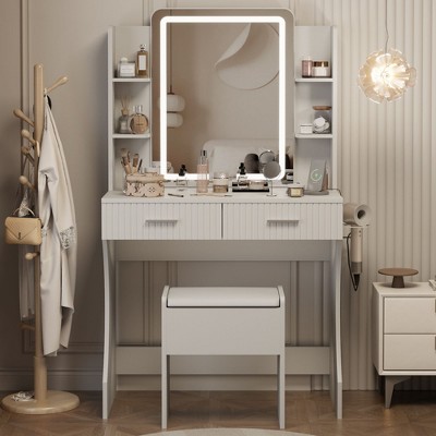 Vanity with Illuminated Mirror: Features a square vanity mirror surrounded by adjustable LED lights for ideal brightness during makeup application. Four fabric drawers and open shelves keep cosmetics, jewelry, and skincare neatly organized.