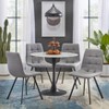 Bring contemporary flair to your kitchen space with the 5-Piece Rho Dining Set from Buylateral. Clean lines enhance the marble look top against the striking 19.6” diameter metal pedestal base finished in black. The white faux marble top with gray veining is finished with tempered 8 mm thick glass, creating an easy to clean durable surface. Creatively paired with a hint of vintage style, the set of 4 padded chairs are upholstered in a neutral gray fabric, detailed with tufting, while the black angled metal legs complement the sleek style of the pedestal base.