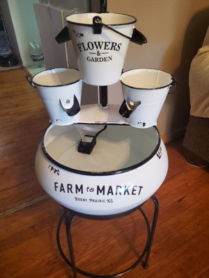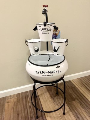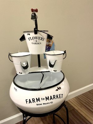 [This review was collected as part of a promotion.] I got the Alpine white buckets with faucet tabletop fountain decoration in exchange for my honest review. This piece is 36" tall an fits perfectly on a table. It reminds me of a vintage metal bucket and looks great on my porch. Its a perfect addition to a country setting