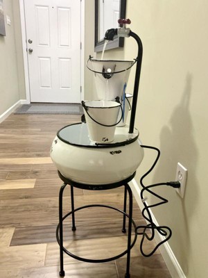 [This review was collected as part of a promotion.] I adore this Alpine white buckets with faucet fountain. It's made to look like the old time metal enamel buckets and looks great with our farmhouse decor!! Very sturdy and well made steel & Iron construction. Water falls delicately...so it's not to disrupting. The black stand is included. The pump has little suction cups to hold it in place and the plug is a 3 prong. Assembles easily and quickly!