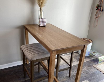 This is a nice and sturdy table! Perfect for my counter height stools and easy to assemble. I wish it was a little wider; I can’t fit placemats on both sides without them overlapping, but it still works!