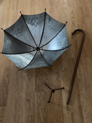 [This review was collected as part of a promotion.] My patio is my oasis and this inverted ornamental umbrella fits well with my rustic décor. It is lightweight and but well-constructed. The canopy is made of weathered sheet metal that is beautifully embossed. Assembly was effortless. The instructions, with images, were fool-proof. Simply insert handle through center of canopy and screw into the three-prong stake. The three-legged stake is rigid and sturdy; when it is inserted fully into the ground, I am confident it will keep the umbrella and any contents from overturning. The canopy also has four pre-drilled drainage holes which is a plus with any planter. It is semi-deep (about 9”) and has ample room for planting my seasonal flowers, such as petunias, inpatients and mums. I highly recommend to any garden enthusiast or as a housewarming gift as it is very versatile!