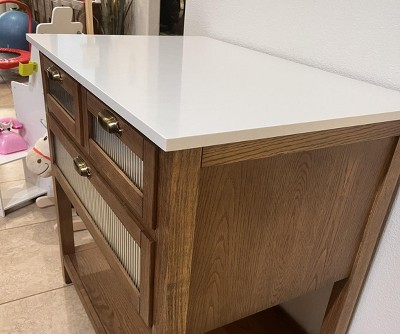 It’s over priced particle board for the quality you get. Husband had a hard time putting together; split wood, screws that were stripped and wouldn’t thread, took hours to get together. Had to use our own screws and leave off some washers it was a pain! It’s nice looking all said and done. But def over priced. Quality wise I’d say this is a $300 to 400 instead. The stone top is super heavy. This needs to be anti tip kit to a stud of you have small children. We are using as a side board. The stone white top has some flaws of stains but they are hardly noticeable. I love the brown wood color. How long will it hold up?? I don’t know. I plan to put my air fryer and microwave on top.