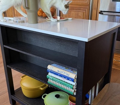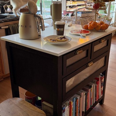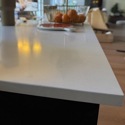 I took a chance without any review pics to go off of, but it’s perfect! It took 4-5 hrs to put together but the quality is so nice. I was curious about the material of the top but it seems like a good quality material (some kind of faux quartz). It’s very easy to get gunk off of. The shelving on one side and drawers on the other is so perfect for displaying cute pots and storing away linens or towels you don’t want to be seen. We’ve also been storing onions/potatoes in one of the small drawers. The drawers are not soft close - just a warning. 10/10 for me!