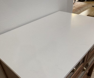 Great quality, nice and sturdy. Countertop is an engineered white stone.
