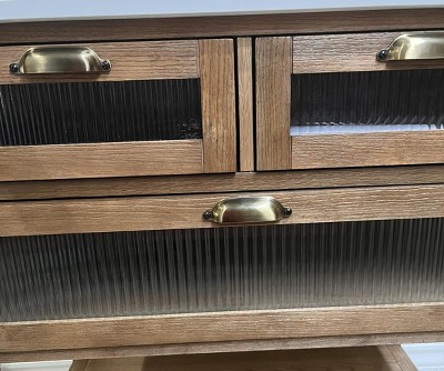 Upgrade your kitchen space with the Reeded Glass Kitchen Island Collection from Hearth & Hand™ with Magnolia. This collection showcases kitchen islands designed with wooden frames and reeded glass for a natural, elevated aesthetic. With light and dark finishes, and the option of an extended countertop for seating, these kitchen islands feature square legs, multiple drawers and metal pull handles, providing a neat look and practical style.