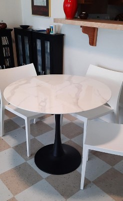 Given the price, I was concerned about the quality of this table. Now that it's assembled, it looks great! The base is the right kind of matte, and the top looks like marbled glass. Neither looks cheap or plasticky. Looks great with black leather chairs!