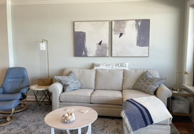 Give your living room a summer refresh with soft colors and natural textures. An area rug helps define the space and color palette Layering in small touches like a throw pillow or a blanket are easy ways to add patterns and colors to sofas and chairs. Add more of the season to your space with plants, scented candles and woven baskets for storage and décor.