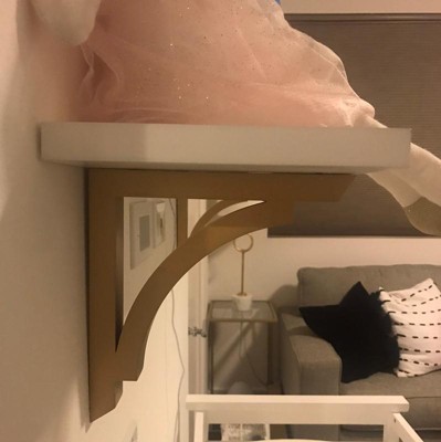 - Constructed with a reliably sturdy wooden material, this shelf was made to endure. The wooden brackets are a casual, curved style that add appeal and strength