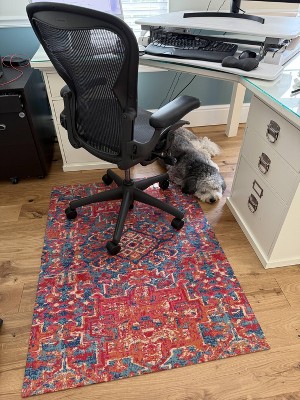 I bought this to replace my ugly plastic chair mat after I had my wooden floors replaced. This is really pretty, so much better! It's very sturdy and fairly thick but my desk chairs rolls very smoothly over it. It's more solid than a rug but it looks like a rug. It really brightens up my office!