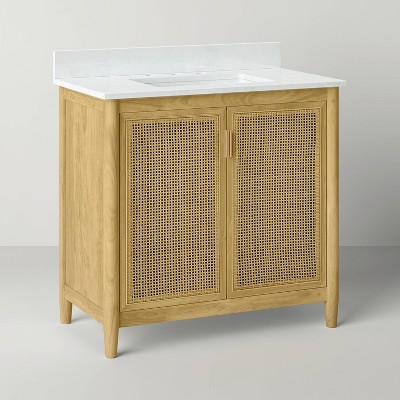Overall Dimensions: 36""L x 18.3""W x 33.8""H Cabinet Base: 35.4""L x 17.36""W x 33.1""H Sink Top: 36""L x 18.3""W x 4.7""H Total Weight: 109.35 lbs (Cabinet: 73.35 lbs, Sink: 36 lbs) Color: White Material: Solid Rubberwood + MDF + Ceramic Mounting Type: Freestanding Sink Type: Undermount / Drop-In Sink Location: Center Edge Thickness: 0.7"" Faucet Mount: 4"" (faucet not included) Number of Doors: 2 Number of Drawers: 3 (including 1 tilt-out drawer) Capacity: 150 lbs Hardware Included: Yes (Gold Zinc Alloy Handles) Assembly Required: Yes Country of Origin: Vim